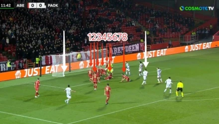 Τα καρέ από την τηλεοπτική μετάδοση δίνουν και παίρνουν, ένα εμπνευσμένο είναι αυτό που έχουν βάλει βελάκια σε κάθε έναν από τους οκτώ παίκτες της Αμπερντίν που «χόρεψε» ο Ντέλιας, ενώ θα πρέπει να αποδώσουμε τα εύσημα στον φωτογράφο της επίσημης σελίδα της Αμπερντίν που έπιασε με τον φακό του την στιγμή του πλασέ του νεαρού άσου.