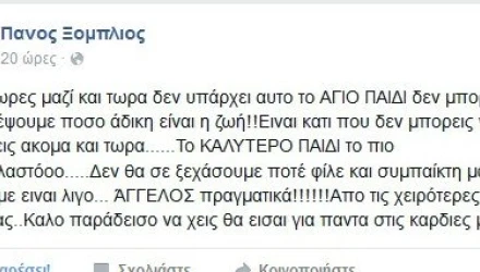 Ενδεικτικό το μήνυμα του συμπαίκτη του, Πάνου Ξόμπλιου, που ανέφερε μεταξύ άλλων στο facebook: «Δεν θα σε ξεχάσουμε ποτέ φίλε και συμπαίκτη μας ότι και να πούμε είναι λίγο... ΆΓΓΕΛΟΣ πραγματικά! Από τις χειρότερες μέρες της ζωής μας... Καλό παράδεισο να ‘χεις θα είσαι για πάντα στις καρδιές μας!».