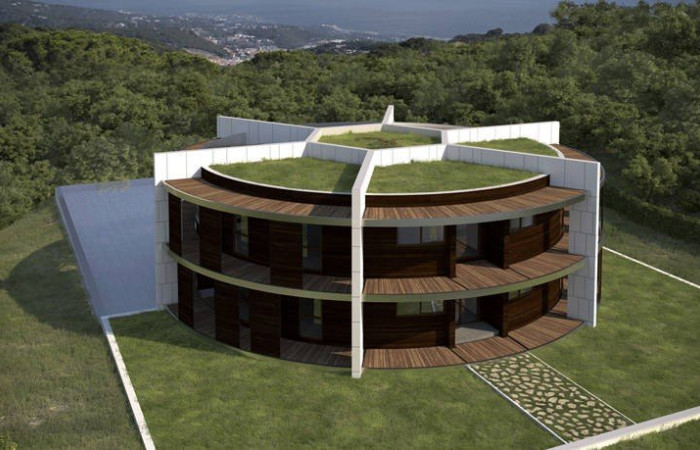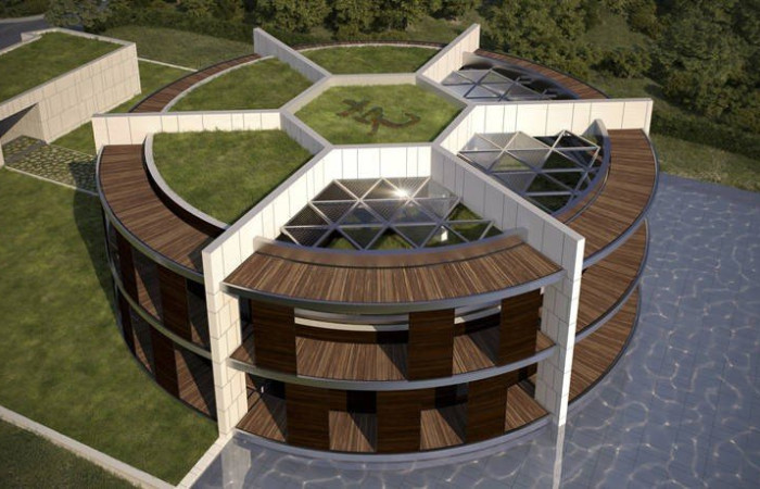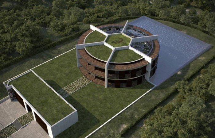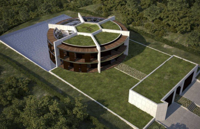 Το τεράστιο κυκλικό σπίτι είναι χτισμένο με τις αρχές της βιώσιμης αρχιτεκτονικής και της οικολογίας κατά νου. Ακόμα και η μισή στέγη είναι καλυμμένη με πράσινο, την ίδια ώρα που η άλλη μισή έχει γυαλί, για να τρυπώνει ανεμπόδιστα το ηλιακό φως στο εσωτερικό.