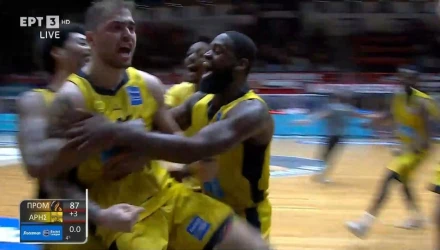 Ο Άρης επικράτησε 87-88 του Προμηθέα στην Πάτρα με τον Βασίλη Τολιόπουλο να σκοράρει ένα απίθανο τρίποντο στην εκπνοή και να στέλνει τους ''κιτρινόμαυρους'' στα ημιτελικά του Πρωταθλήματος, όπου θα αντιμετωπίσει τον Παναθηναϊκό.