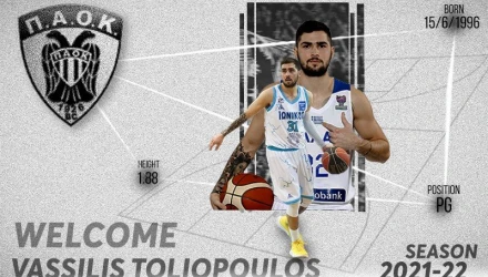 Η ΚΑΕ ΠΑΟΚ ανακοινώνει την συμφωνία με τον Έλληνα καλαθοσφαιριστή Βασίλη Τολιόπουλο. Ο 25χρονος γκαρντ, θα υπογράψει συμβόλαιο συνεργασίας δυο ετών με την ομάδα μας.