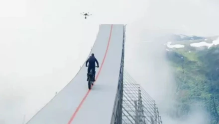 Θεαματικό άλμα στο κενό με μοτοσικλέτα στο «μεγαλύτερο stunt που έγινε ποτέ στην ιστορία του κινηματογράφου» επιχείρησε ο Τομ Κρουζ, στο πλαίσιο των γυρισμάτων για τη νέα, έβδομημ ταινία των «Επικίνδυνων Αποστολών», και συγκεκριμένα την πρώτη από τις δύο ταινίες Mission: Impossible - Dead Reckoning.