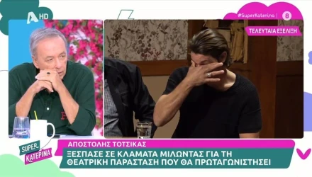 «Πρέπει να βοηθήσουμε τον κόσμο να βρει την αλήθεια του και να προχωρήσουμε επιτέλους, να κάνουμε το επόμενο βήμα σε αυτή τη ζωή» είπε μιλώντας για το θεατρικό έργο ο Αποστόλης Τότσικας και ξέσπασε σε κλάματα ενώ ο Γιώργος Κωνσταντίνου βρισκόταν δίπλα του.