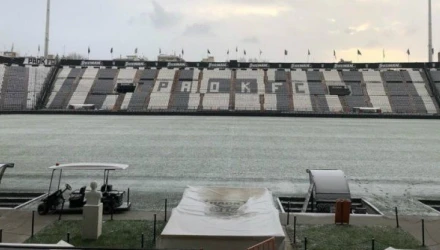 Λόγω της κακοκαιρίας που πλήττει μεγάλα τμήματα της Θεσσαλονίκης από το πρωί της Πέμπτης (3/1) το γήπεδο της Τούμπας «ντύθηκε» στα λευκά.
