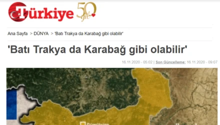 Με τίτλο: «Η Δυτική Θράκη μπορεί να γίνει σαν τον Καραμπάχ», η τουρκική φιλοκυβερνητική εφημερίδα Τurkiye, παρουσιάζει υποτιθέμενες «ανησυχίες» στην Ελλάδα, για καταστάσεις στην Β.Α περιοχή της χώρας, ανάλογες μ’ αυτές στο νότιο Καύκασο.