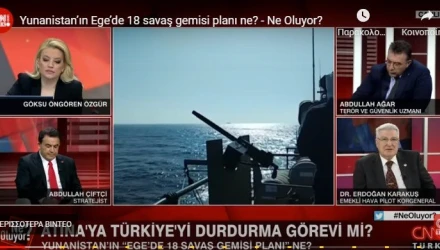 Μιλώντας σε ενημερωτική εκπομπή του του τουρκικού τηλεοπτικού σταθμού CNNturk, ο τούρκος αναλυτής και απόστρατος αεροπορίας Ερντογάν Καρακούς είπε ότι «Η νούμερο ένα απειλή για την Τουρκία είναι η Ελλάδα, διότι τα συμφέροντα συγκρούονται».