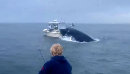 Εφιαλτικές στιγμές έζησαν δύο ψαράδες στο Νιού Χάμσαϊρ των ΗΠΑ όταν είδαν μια φάλαινα να πέφτει στη βάρκα τους.