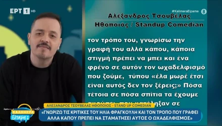 Ο Αλέξανδρος Τσουβέλας απαντά μέσα από το «Καλημέρα είπαμε;» στην σκληρή κριτική του Ηλία Φραγκούλη για την ταινία του, οποίος μεταξύ άλλων έκανε λόγο για επαναφορά της θανατικής ποινής προκειμένου να μην ξαναδούμε στην τηλεόραση τον γνωστό κωμικό.