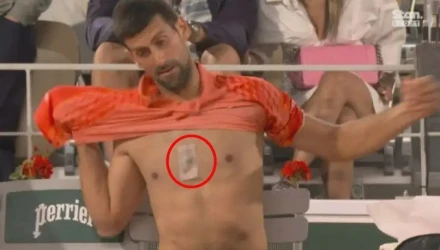 Novak Djokovic currently has a clear piece of tape on his chest with something in the center.