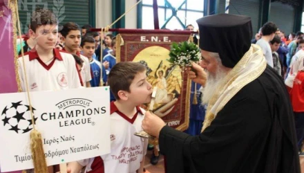 Μετά την εντυπωσιακή παρέλαση των ομάδων των Ενοριακών Νεανικών Εστιών, υπό τον ήχο του ύμνου του Champions League, ο Μητροπολίτης Νεαπόλεως και Σταυρουπόλεως κ. Βαρνάβας τέλεσε την ακολουθία του Αγιασμού και ευχήθηκε σε όλους τους συμμετέχοντες να έχουν ως παράδειγμα τους Αγίους της Εκκλησίας.