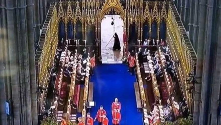 Ένα άτομο με κουκούλα, μαύρη ρόμπα που κουβαλούσε μια μακριά ράβδο, παρόμοια με δρεπάνι, πιάστηκε να τρέχει μπροστά στις χρυσές καμάρες μέσα στον καθεδρικό ναό το Σάββατο (6/5). «Πρόσεξε κάποιος άλλος τον Grim Reaper στο Αββαείο του Γουέστμινστερ;» έγραψε ένα άτομο στο Twitter , συγκεντρώνοντας 2 εκατομμύρια προβολές.