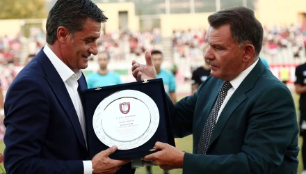 Ο πρόεδρος των Αχαιών είπε μεταξύ άλλων ότι πρόκειται για μια μεγάλη προσωπικότητα του παγκόσμιου ποδοσφαίρου, που δίδαξε ήθος στον χώρο και είναι τιμή για την Παναχαϊκή, που δίνει το «παρών» στο γήπεδό της και στην πόλη της Πάτρας.