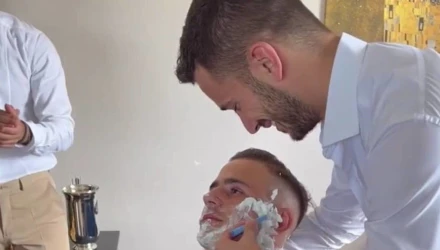 Το έθιμο με το ξύρισμα του γαμπρού τήρησε ο Έλληνας ποδοσφαιριστής, με τον κουμπάρο του Γιώργο Τσονάκα, συνεργάτη του Ραζβάν Λουτσέσκου, να τον ξυρίζει.